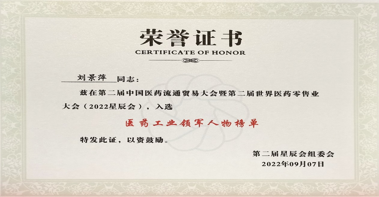 本次星辰会期间,AG亚娱斩获颇丰,获得多项行业奖项及荣誉。在开幕式上,刘景萍董事长荣获“医药工业领军人物”称号。